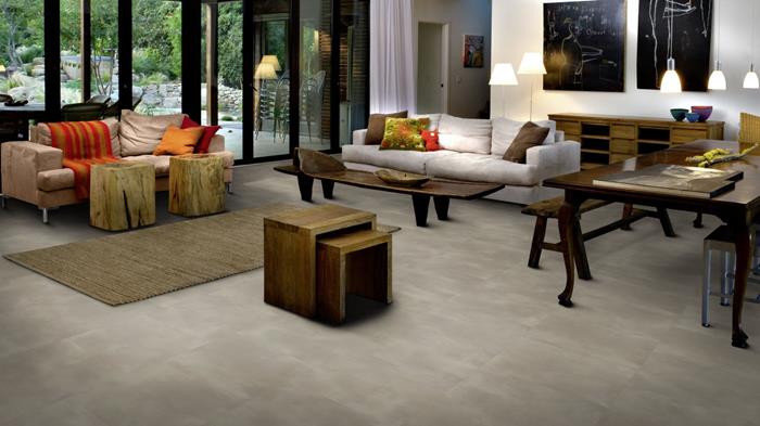 Our Luxury Tiles Dry Back collection is available in a wide selection of wood and stone designs. The wood designs range from traditional to elegant herringbone and rustic, while the stone designs span from classic stone to concrete. It also includes exciting patterns. The Dry Back floors, with a 0.7 mm wear layer, are based on virgin vinyl and constructed in five different layers, topped by a ceramic coating. The result is extremely resilient and strong floors resistant to both scratching and water, which means that these floors are suitable even for spaces exposed to heavy traffic. Just like all our other Luxury Tiles floors, they are phthalate-free.