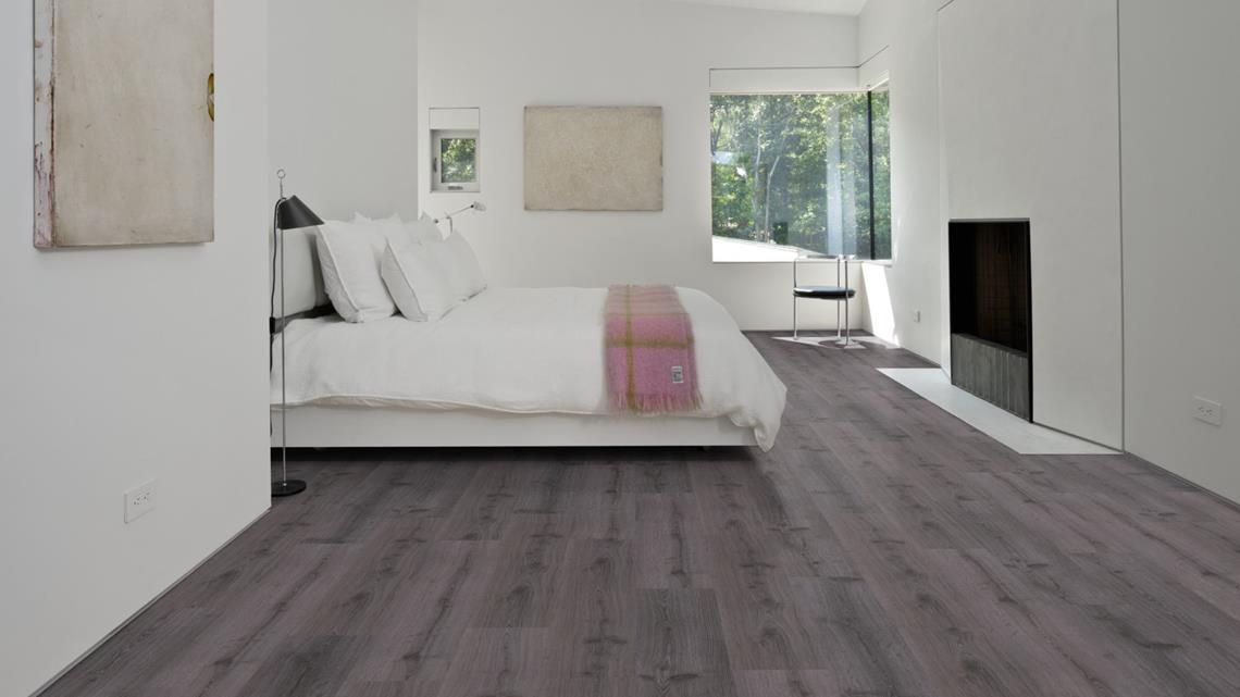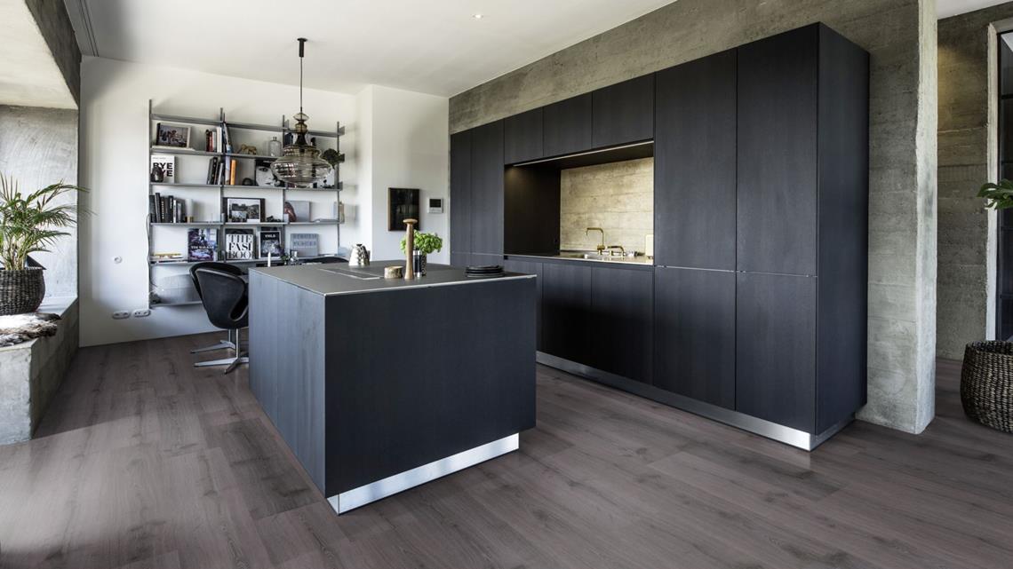 Kährs Luxury Tiles Click floor Didnok with deep dark shades of grey and a rustic wood appearance is a true statement floor that perfectly complements any interior. A realistic wood grain and authentic knots and cracks give the floor an expressive impression. The skilfully created wood appearance is enhanced by synchrone embossing for a natural look and feel.