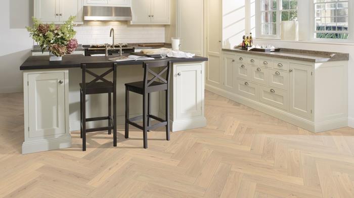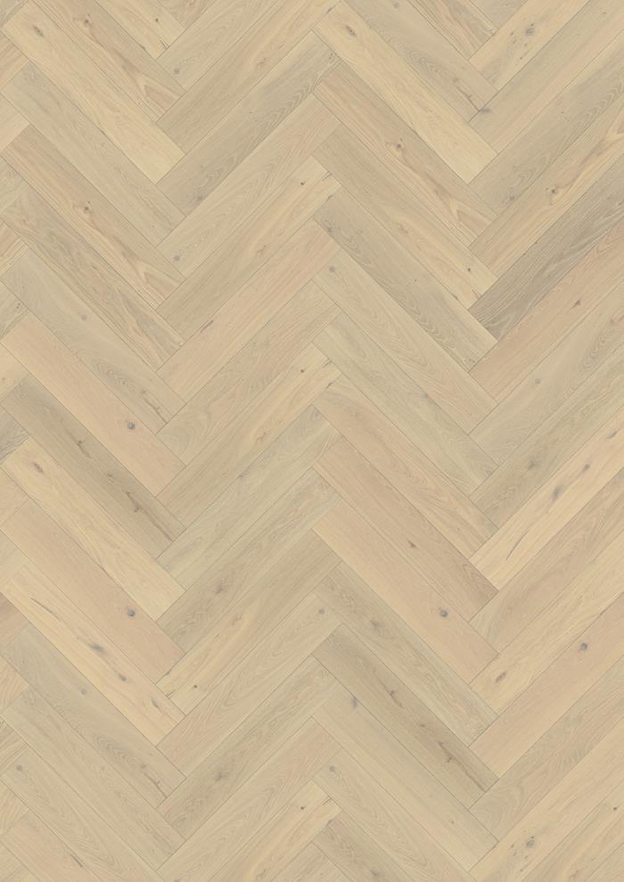 Herringbone Oak CD White oil, a 2-layer construction, is a colorful oak floor with both color variations and knots. Separate item numbers are ordered and used to complete Herringbone-pattern installation.