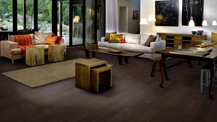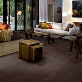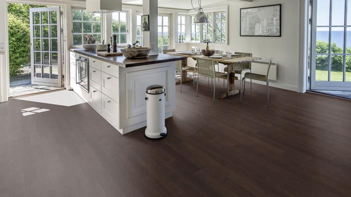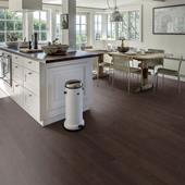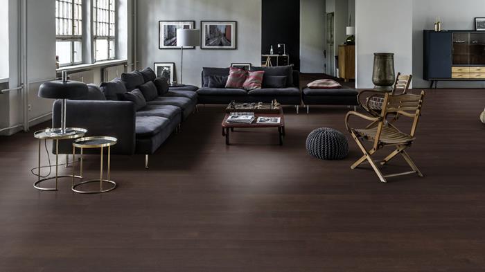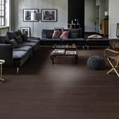 The rich coffee tones in this single-strip oak floor from the Living Collection are enhanced by naturally occurring knots found in the timber for a refined expression. The matt lacquer finish eliminates glare while protecting the wood from daily wear. Each board is carefully brushed to bring out the character of the grain and highlight the texture of the wood. Four-sided micro-bevelling at the edges ensures a classic full plank look and feel.