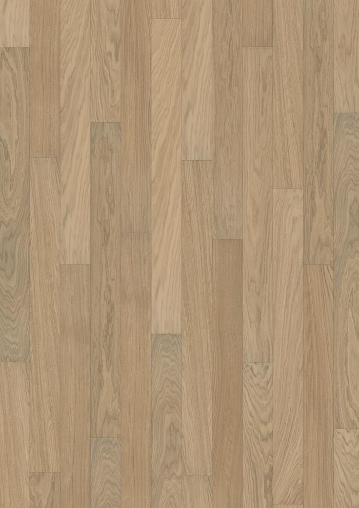 The light white stain on this single-strip, FSC-certified oak floor from the Living Collection enhances its finish, which ranges in hue from taupe to blond tan. Four-sided micro-bevelling at the edges ensures a classic full plank look and feel. The matt lacquer finish eliminates glare while protecting the wood from daily wear..