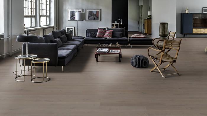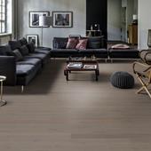 The even, heather-grey stain on this single-strip oak floor from the Canvas Collection results in a clean and versatile expression. Each board is carefully brushed to bring out the character of the grain and highlight the natural texture of the wood. The matt lacquer finish eliminates glare while protecting the wood from daily wear. Four-sided bevelling at the edges ensures a classic full plank look and feel.
