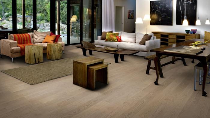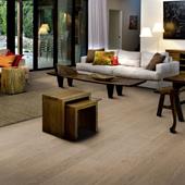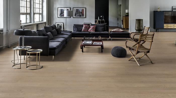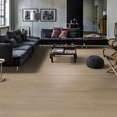 The soft blonde tones in this single-strip oak floor from the Canvas Collection are enhanced by a chalky-grey stain resulting in a clean expression. Each board is carefully brushed to bring out the character of the grain and highlight the natural texture of the wood. The matt lacquer finish eliminates glare while protecting the wood from daily wear. Four-sided bevelling at the edges ensures a classic full plank look and feel.