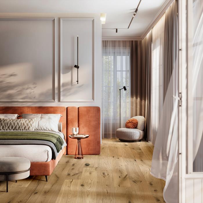 Lynx Ultra Matt pairs striking character with a contemporary, ultra-matt look. The oak’s lively knots, cracks, and color variation are highlighted by a thorough brushing that emphasizes the grain, then refined with a 4-sided micro-bevel. Larger knot openings are hand-repaired with wooden plugs and filler to showcase artisanal detail. The ultra matt lacquer finish delivers a bare-wood appearance with excellent durability and easy maintenance.