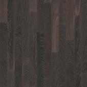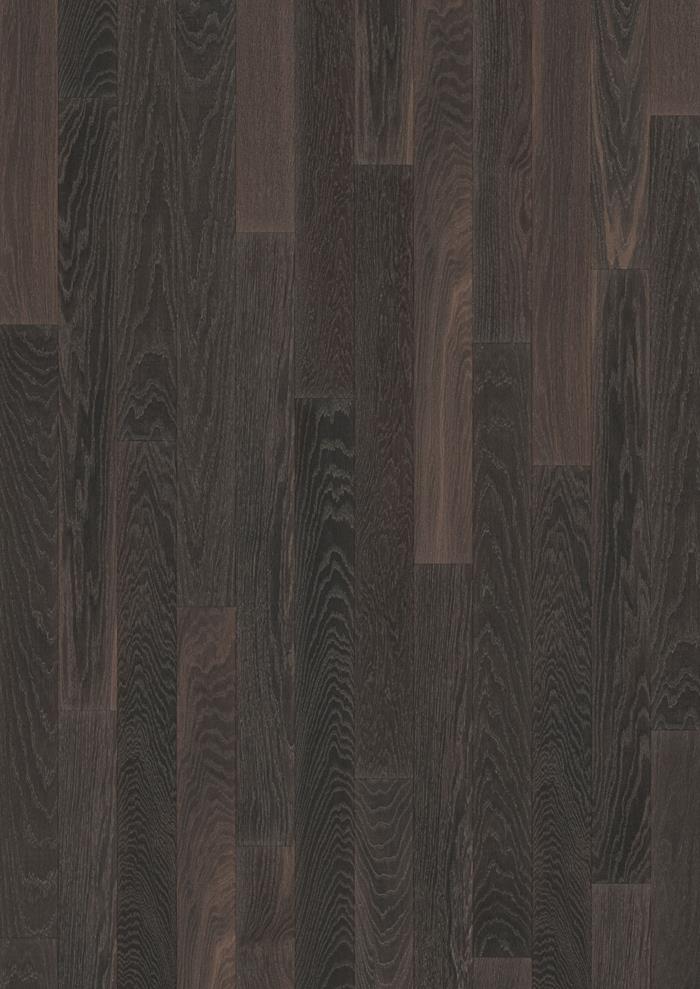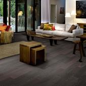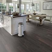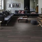 The smoked, truffle black finish on this single-strip, FSC-certified oak floor from the Living Collection creates an exclusive expression, highlighted by naturally occurring knots in the timber. The matt lacquer finish eliminates glare while protecting the wood from daily wear. Each board is carefully brushed to bring out the character of the grain and the texture of the wood. Four-sided micro-bevelling at the edges ensures a classic full plank look and feel.