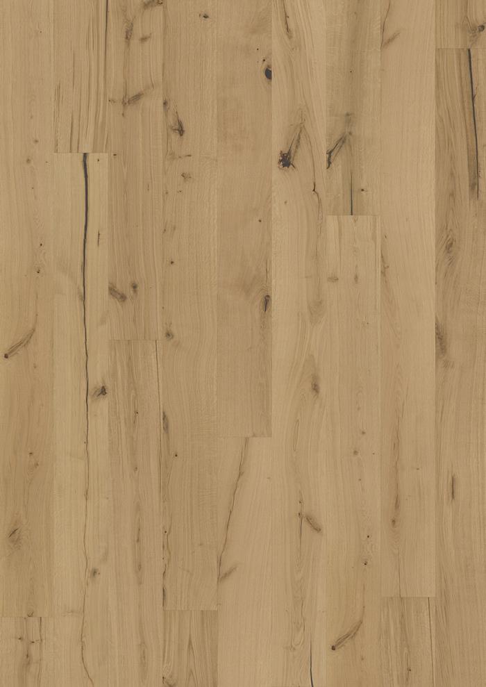 The barely-there sepia stain on this single-strip oak floor from the Texture Collection allows natural tones to show through. Each board is heavily brushed and the genuine cracks and knots in combination with the saw marks bring out the character of the grain and highlight the natural texture of the wood. Four-sided beveling at the edges ensures a classic, full plank look and feel.