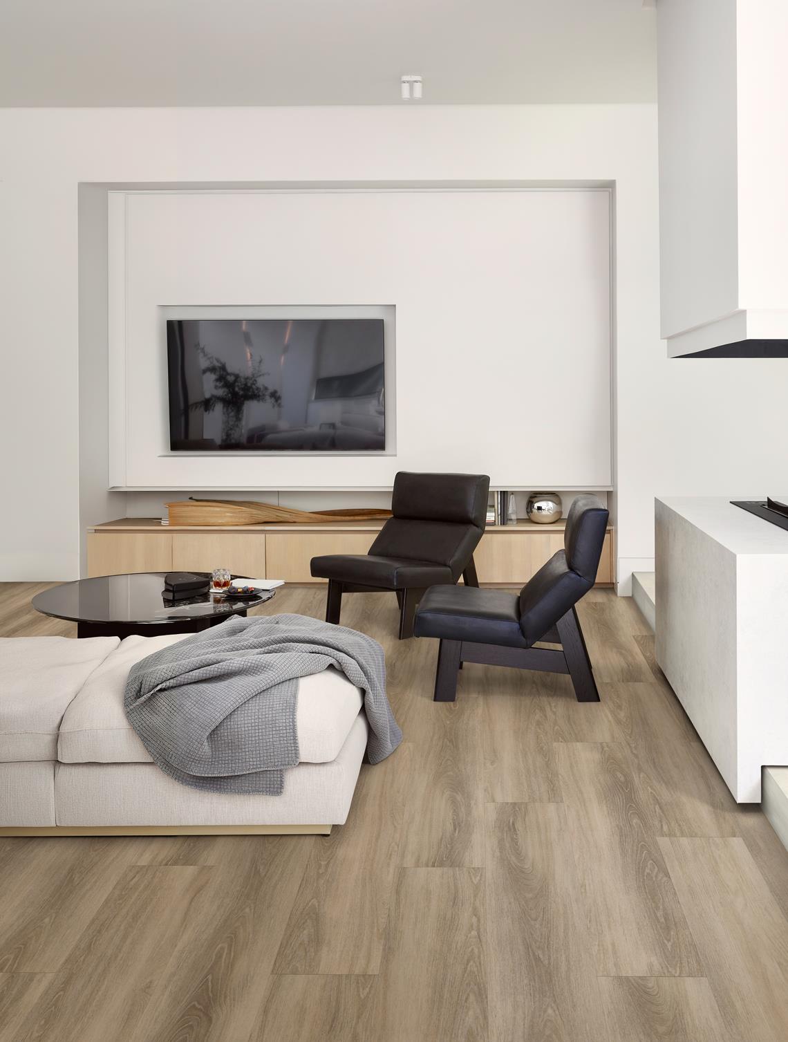 Le sol Click Hanmer de Kährs Luxury Tiles combine les couleurs du bois de chêne naturel avec des nuances de sable chaud. Hanmer a un aspect naturel vraiment authentique. Avec des nuances chaudes et un design en bois de qualité, le sol crée sans effort une atmosphère relaxante dans tout intérieur.